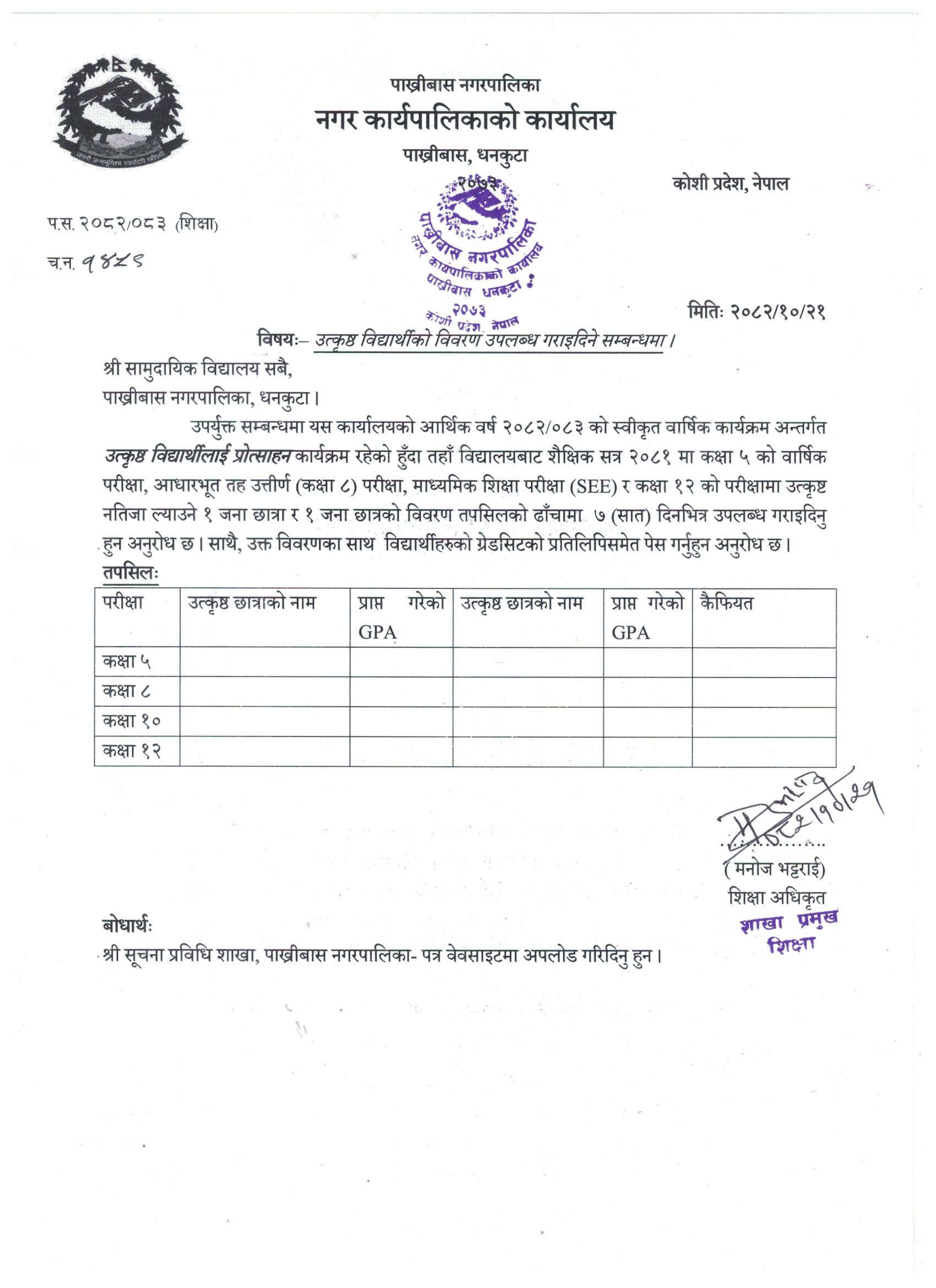 उत्कृष्ठ बिद्यार्थीको विवरण उपलब्ध गराइदिने सम्बन्धमा l