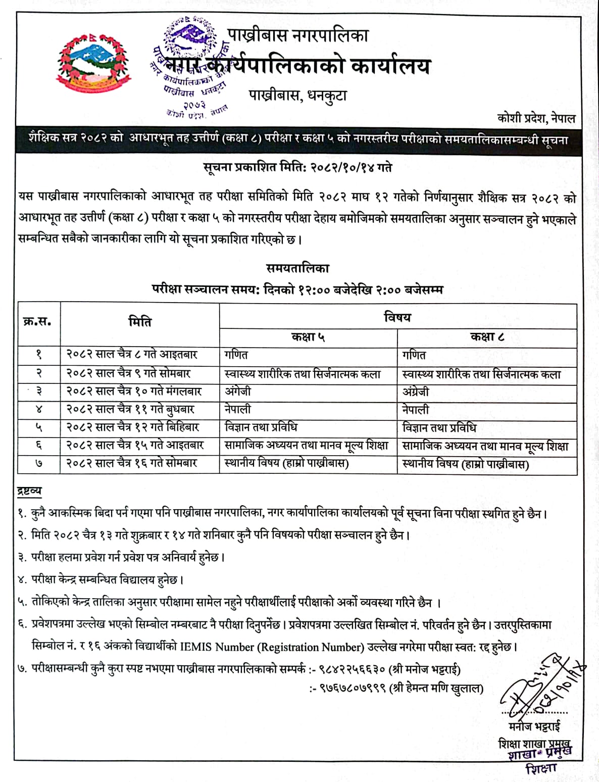 » शैक्षिक सत्र २०८२ को आधारभूत तह (कक्षा ८) परीक्षा र कक्षा ५ को नगरस्तरीय परीक्षाको समय तालिका सम्बन्धी सूचना ।