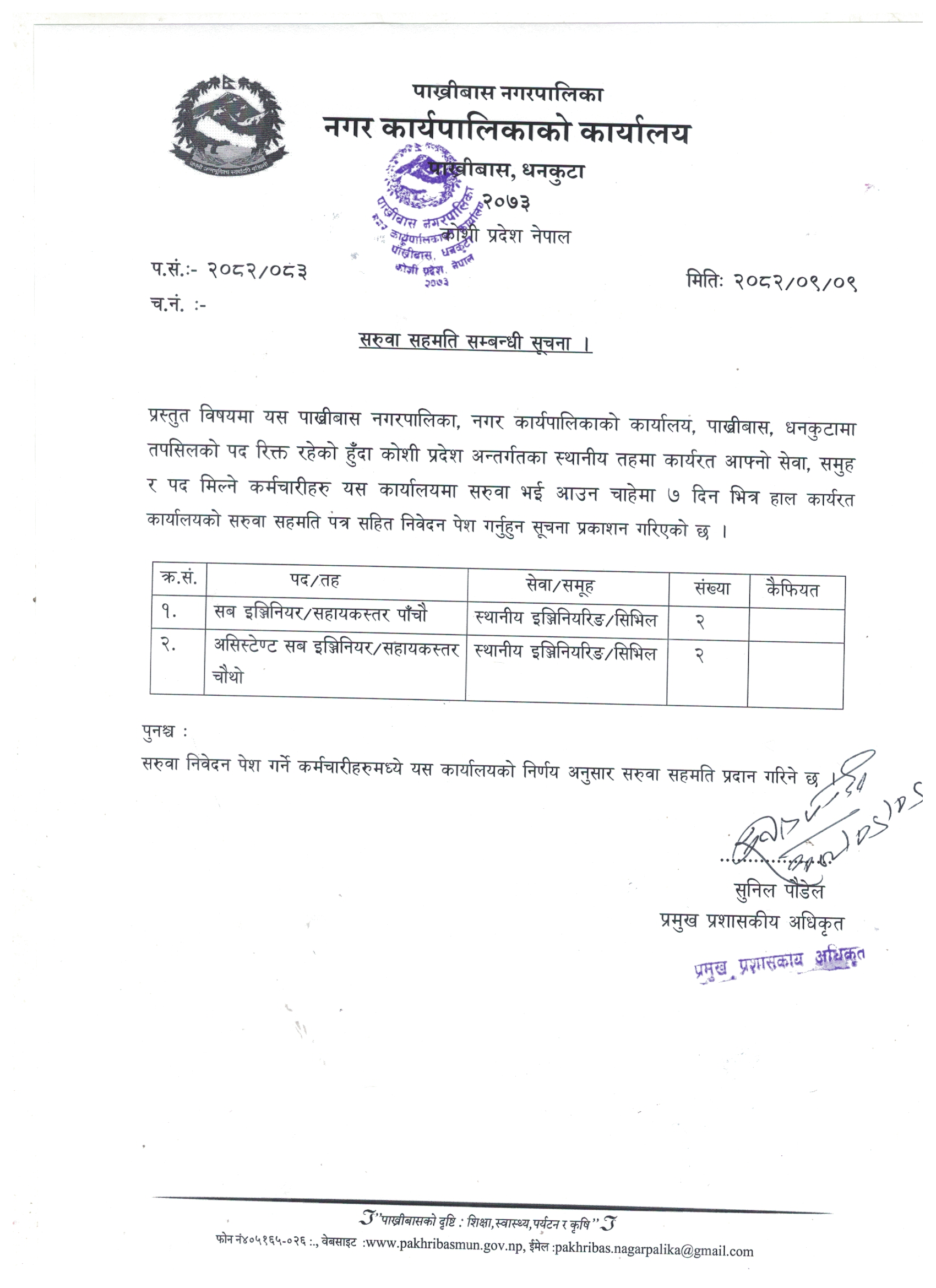 पाख्रीबास नगरपालिकामा सेवा करारमा पदपूर्ति गर्ने सम्बन्धी सूचना l