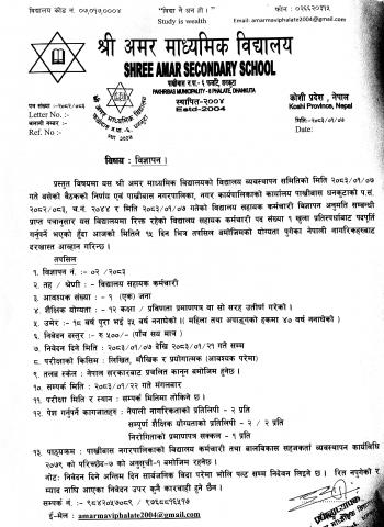 » विद्यालय सहायक कर्मचारी आवश्यकता सम्बन्धी श्री अमर माध्यमिक विद्यालयबाट प्रकाशित विज्ञापन ।