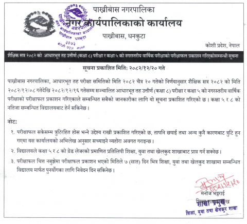 शैक्षिक सत्र २०८२ को आधारभूत तह उत्तीर्ण (कक्षा ८) परीक्षा र कक्षा ५ को नगरस्तरीय वार्षिक परीक्षाको परीक्षाफल प्रकाशन गरिएकोसम्बन्धी सूचना