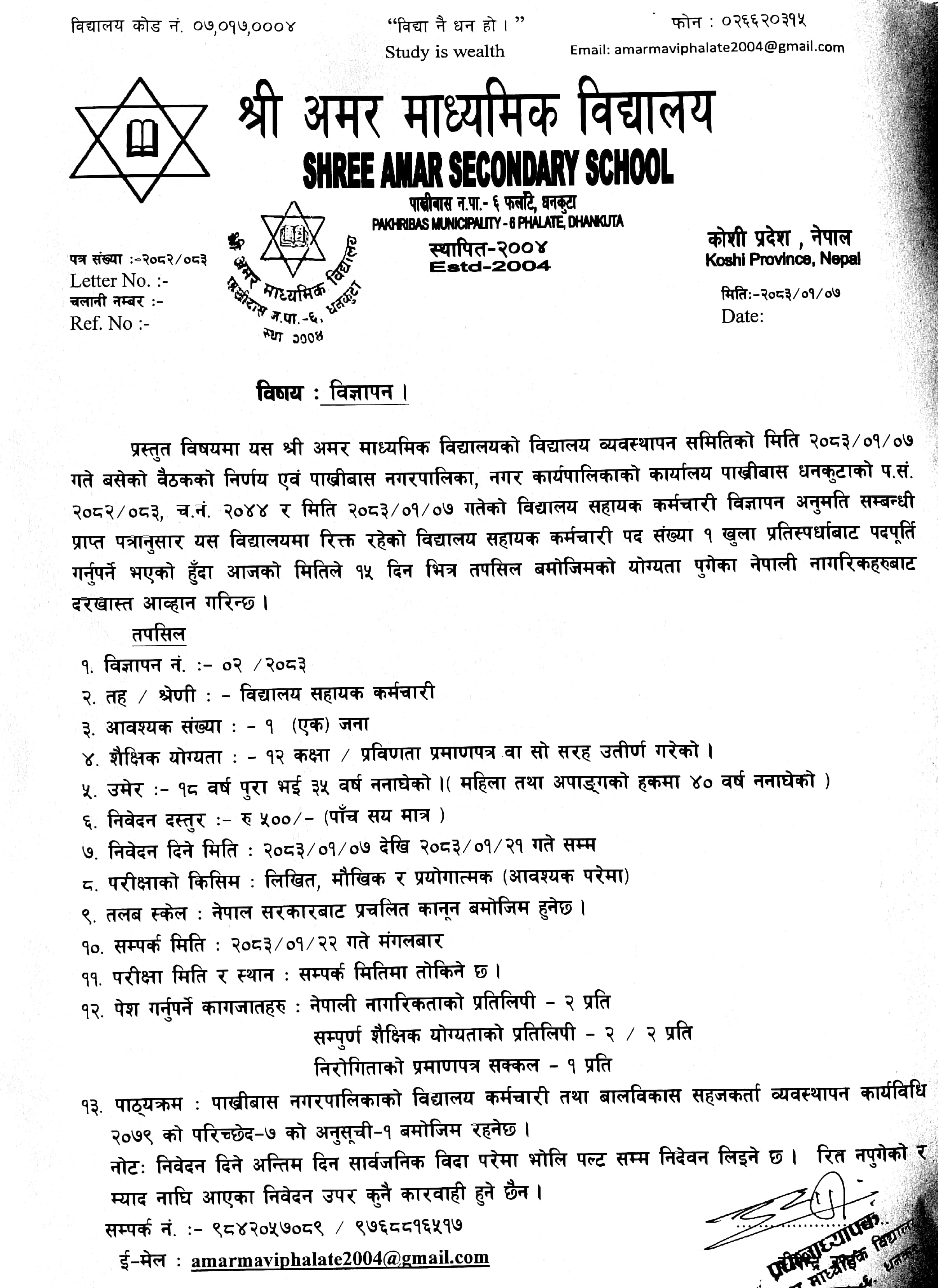 विद्यालय सहायक कर्मचारी आवश्यकता सम्बन्धी श्री अमर माध्यमिक विद्यालयबाट प्रकाशित विज्ञापन ।