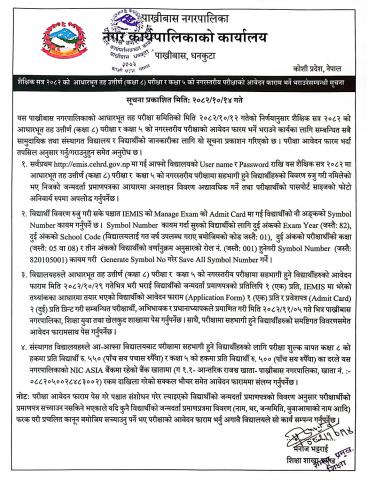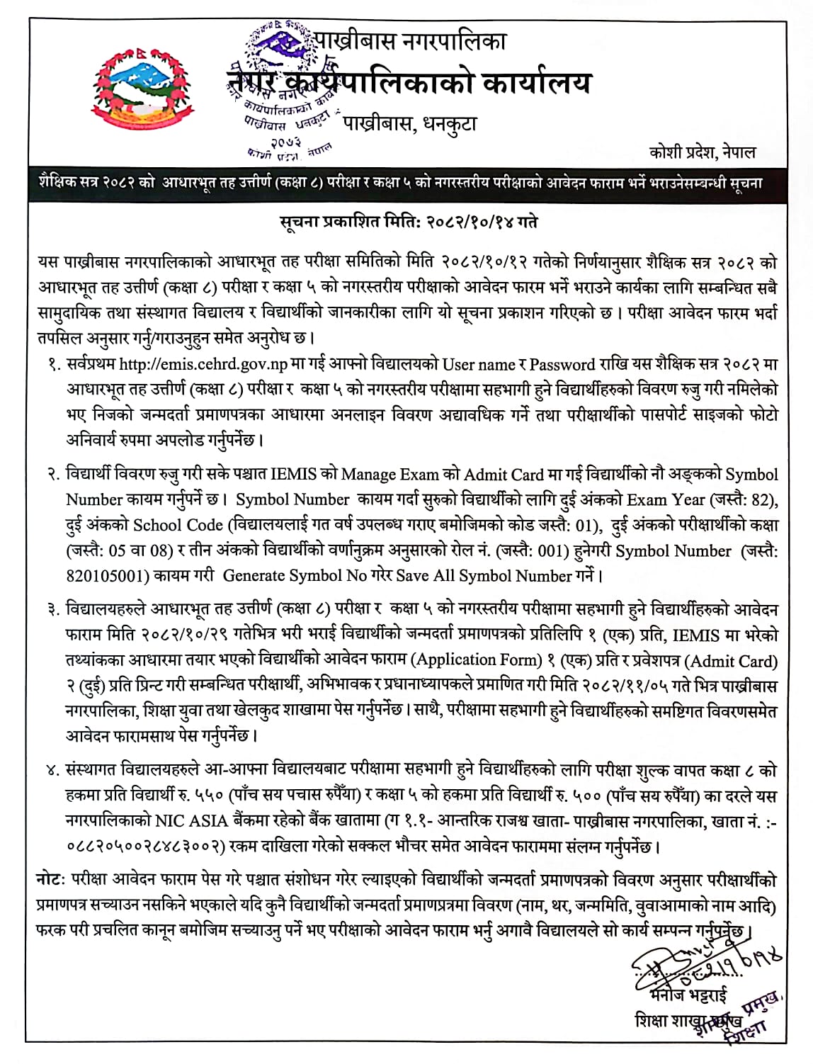 शैक्षिक सत्र २०८२ को आधारभूत तह (कक्षा ८) र कक्षा ५ को नगरस्तरीय परीक्षाको आवेदन फारम भर्ने भराउने सम्बन्धी सूचना ।