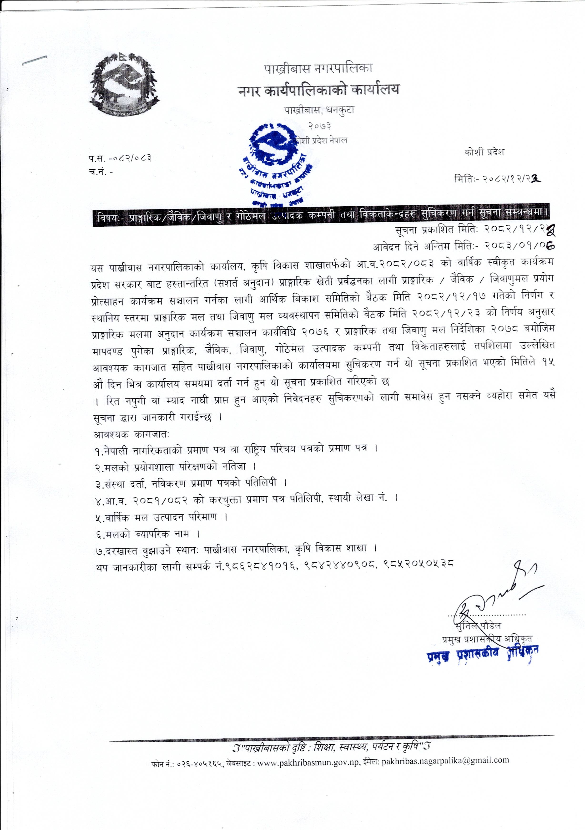 प्रङ्गरिक/जैविक/जिवाणु र गोठेमल उत्पादक कम्पनी तथा विक्रेताकेन्द्रहरु सूचिकरण गर्ने सम्बन्धमा ।