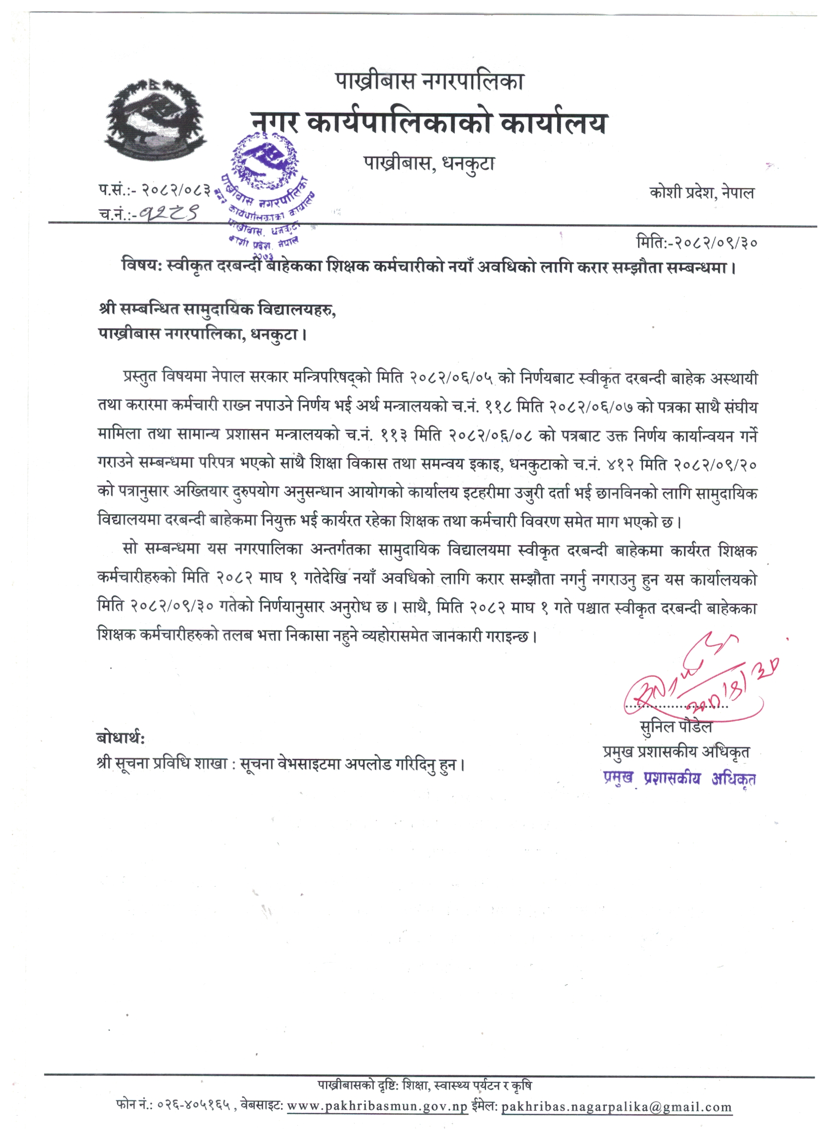 स्वीकृत दरबन्दी बाहेकका शिक्षक कर्मचारीको नयाँ अवधिको लागि करार सम्झौता सम्बन्धमा l